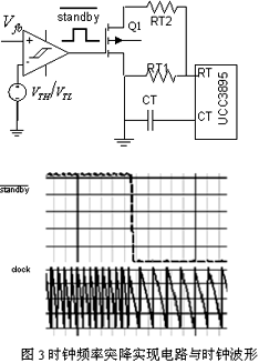 突降實現(xiàn)方法如圖3:以UCC3895為例,當(dāng)電源處于正常負(fù)載狀態(tài)時,Q1導(dǎo)通,其時鐘周期為: