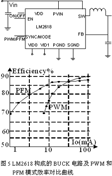 對于額定功率時工作在PWM模式的開關(guān)電源,,也可以通過切換至PFM模式提高待機效率,即固定開通時間,調(diào)節(jié)關(guān)斷時間,負(fù)載越低,關(guān)斷時間越長,工作頻率也越低。圖5是采用NS公司的LM2618控制的Buck轉(zhuǎn)換器電路和分別采用PWM和PFM控制方法的效率比較曲線。由圖可見,在輕載時采用PFM模式的電源效率明顯大于采用PWM模式時的效率,且負(fù)載越低,PFM效率優(yōu)勢越明顯。