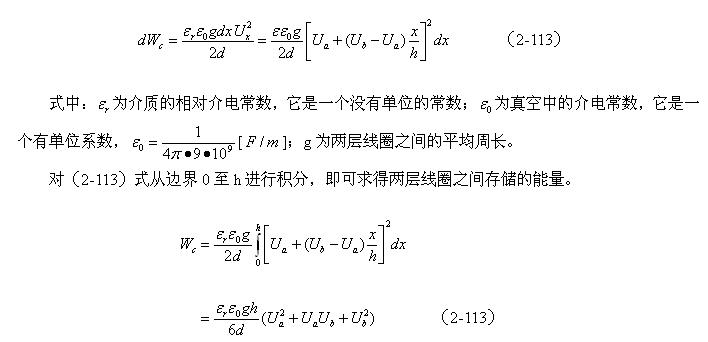 設(shè)兩個(gè)線圈相對(duì)應(yīng)的兩表層間的電場(chǎng)近似均勻分布,即近似平板電容器的電場(chǎng),那么,根據(jù)(2-112)式就可以求得該電場(chǎng)貯存的能量為: