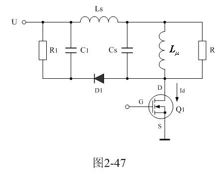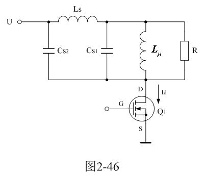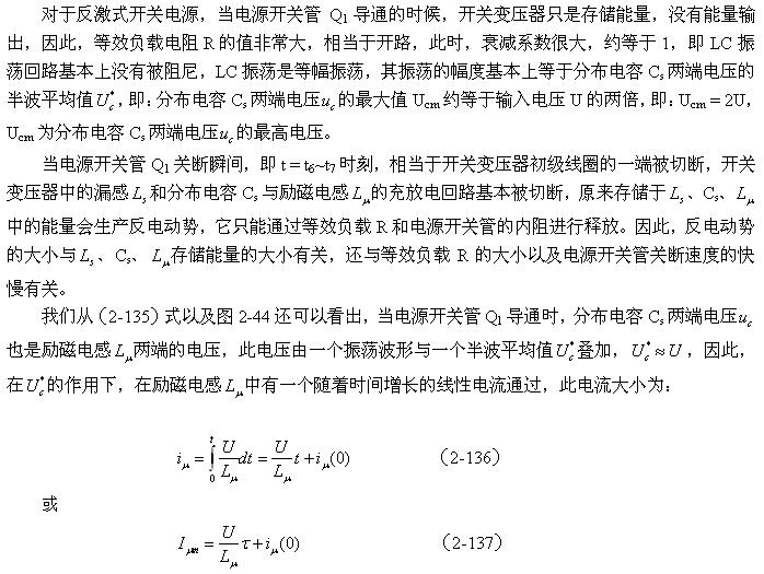 在圖2-46中,Cs1、Cs2都是分布電容,它們對(duì)于漏感 來說,既可以產(chǎn)生串聯(lián)振蕩,又可以產(chǎn)生并聯(lián)振蕩。在電源開關(guān)管Q1導(dǎo)通瞬間,漏感與分布電容主要是產(chǎn)生串聯(lián)振蕩,因?yàn)檩斎腚妷洪_始向串聯(lián)振蕩回路提供能量;在電源開關(guān)管Q1關(guān)斷瞬間,漏感與分布電容主要是產(chǎn)生并聯(lián)振蕩,因?yàn)槁└?必須要通過并聯(lián)回路釋放能量。在實(shí)際應(yīng)用中,漏感相對(duì)于勵(lì)磁電感 來說很小,因此如果不考慮漏感的作用,完全可以把Cs1、Cs2看成是一個(gè)分布電容。