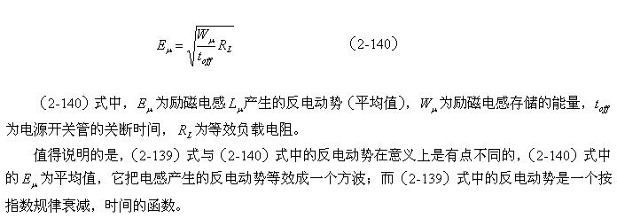(2-140)式對(duì)于計(jì)算漏感 產(chǎn)生的反電動(dòng)勢(shì)或其它電感產(chǎn)生的反電動(dòng)勢(shì)同樣有效。漏感 中存儲(chǔ)的能量可根據(jù)(2-138)式求得;而流過漏感 的電流,對(duì)于反激式開關(guān)電源:可認(rèn)為與勵(lì)磁電流的大小基本相等,因?yàn)?,在反激式開關(guān)電源中,等效負(fù)載電阻等于無限大;對(duì)于正激式開關(guān)電源:可認(rèn)為與流過等效負(fù)載電阻的電流大小基本相等,因?yàn)?,在正激式開關(guān)電源中,勵(lì)磁電流相對(duì)于流過等效負(fù)載電阻的電流,很小。