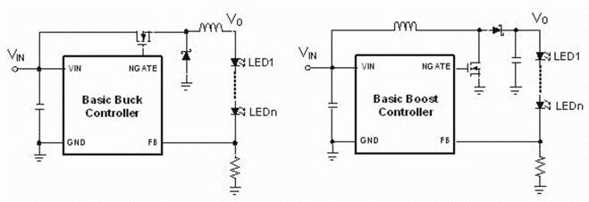 圖1:帶有Vo計(jì)算的Bulk和BoostLED驅(qū)動(dòng):buck:VO=nxVF,VO<VIN;boost:VO=nxVF,Vo>VIN。