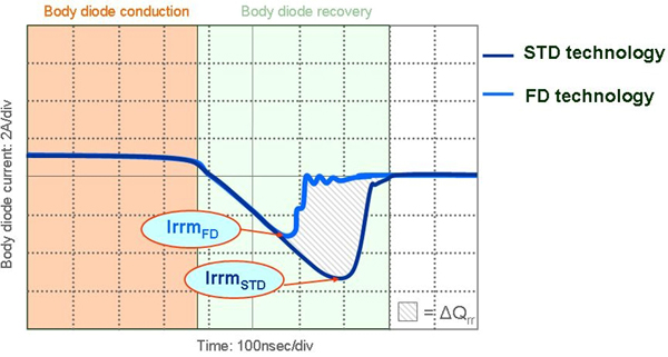 為改善在這些特殊應(yīng)用中體二極管的性能,研發(fā)人員開發(fā)出具有快速體二極管恢復(fù)特性MOSFET。當(dāng)二極管導(dǎo)通后被反向偏置,反向恢復(fù)峰值電流Irrm較小,完成恢復(fù)所需要的時(shí)間更短(見圖3)。