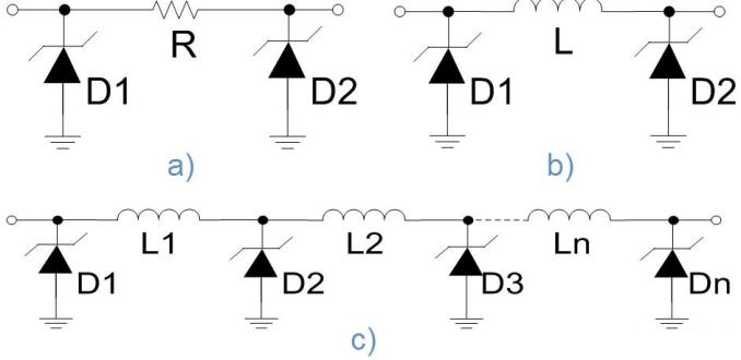 圖2:集成型EMI濾波+ESD保護方案:a)π型RC;b)π型LC;c)LC梯形