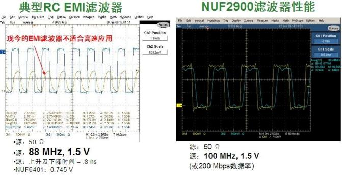 圖4:典型RCEMI濾波器與高速LCEMI濾波器(NUF2900)的響應性能比較。
