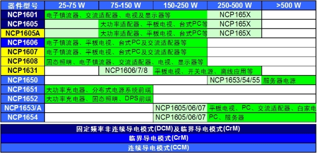安森美半導(dǎo)體提供豐富PFC控制器選擇,如NCP1601/5/6/7/8、NCP1631、NCP1650/1/2/3/4等,涵蓋上述不同工作模式,優(yōu)化用于不同功率的應(yīng)用,見(jiàn)表1。如NCP1606/7/8采用CrM工作模式,適合于功率通常低于300W的中等功率應(yīng)用,如電子鎮(zhèn)流器、液晶電視、等離子電視、臺(tái)式計(jì)算機(jī)和交流適配器等。最新推出的NCP1654均工作在CCM模式,適用于功率大于200W以上的場(chǎng)合。NCP1654的前身NCP1653推出幾年來(lái)已經(jīng)獲得了極大的成功,廣泛應(yīng)用于臺(tái)式計(jì)算機(jī),開(kāi)放式電源等領(lǐng)域。特別是在液晶電視和等離子電視中更是占據(jù)了絕大多數(shù)的市場(chǎng)份額。