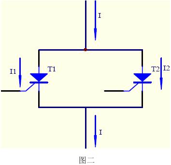 由于單個(gè)元件耐壓水平的提高,每個(gè)元件并聯(lián)工作以增大設(shè)備功率的情形更常見,以兩只晶閘管并聯(lián)工作為例,如圖二所示。