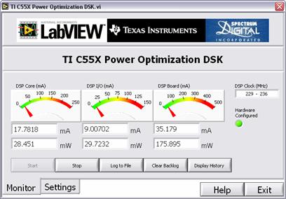 采用LabView和C55電源優(yōu)化DSK(C55PowerOptimizationDSPStarterKit),設計小組能嘗試采用不同的實施方案,并用類似于圖3所示的GUI工具對功耗加以調(diào)節(jié)。