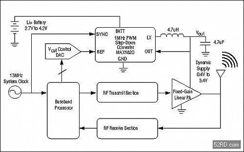 開關(guān)型調(diào)節(jié)器改善發(fā)送效率的基本原理是,通過動態(tài)調(diào)節(jié)功放的供電電壓,使其剛好能夠滿足功放中射頻信號的幅度要求(見圖1)。采用開關(guān)調(diào)節(jié)器高效率地實(shí)現(xiàn)這種調(diào)節(jié),在峰值發(fā)送功率以外的任何條件下,都可大幅度地節(jié)省電池功率。因?yàn)榉逯倒β手挥性谶h(yuǎn)離基站和數(shù)據(jù)傳送時需要,總體來講,這種方案的省電效果是非常顯著的。