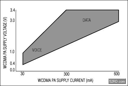 圖2.固定增益的雙極型W-CDMA功率放大器的典型負(fù)載曲線中有一個明顯的阻性成分。電源電壓和電流會從最低的0.4V/30mA(12mW)變化到最高的3.4V/600mA(2040mW),話音的發(fā)送一般在1.5V/150mA(225mW)下進(jìn)行,高速數(shù)據(jù)的發(fā)送一般在2.5V/400mA(1000mW)下進(jìn)行。