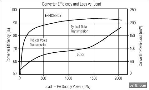 在很寬的負(fù)載范圍內(nèi)具有高效率—沒有高效率,采用開關(guān)型調(diào)節(jié)器就失去了意義,因此,高效率和省電是MAX1820的主導(dǎo)設(shè)計(jì)思想(見圖3)。傳送數(shù)據(jù)時(約500mW至2040mW),MAX1820內(nèi)部的低導(dǎo)通電阻(0.15Ω)PFET功率開關(guān)可以提供高達(dá)93%的效率。傳送話音時(約12mW至500mW),MAX1820內(nèi)部的0.2ΩNFET同步整流器和3.3mA的低工作電流(強(qiáng)制PWM模式)使轉(zhuǎn)換效率達(dá)到85%。85%的效率聽起來不算太高,但對于一個工作在1MHz恒定開關(guān)頻率和很輕負(fù)載的轉(zhuǎn)換器來講確非易事,正如圖3所示,轉(zhuǎn)換器具有極低的功率損耗。這要?dú)w功于優(yōu)秀的設(shè)計(jì)和亞微米工藝的采用,這種工藝能夠在給定的FET導(dǎo)通電阻下獲得更低的柵極電容。