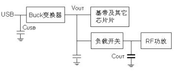 對(duì)于這種架構(gòu),有時(shí)負(fù)載開(kāi)關(guān)會(huì)連接到降壓變換器輸出(圖2),然后射頻模塊連接到負(fù)載開(kāi)關(guān),這樣降壓變換器就只能用較小的輸入電容。這將導(dǎo)致輸入電壓紋波大,尤其是其輸出瞬態(tài)過(guò)載時(shí),輸入電壓的最低點(diǎn)可能低于其最小工作電壓Vcc(Min),系統(tǒng)將關(guān)斷而復(fù)位重新起動(dòng),因此也不建議采用這種方式。