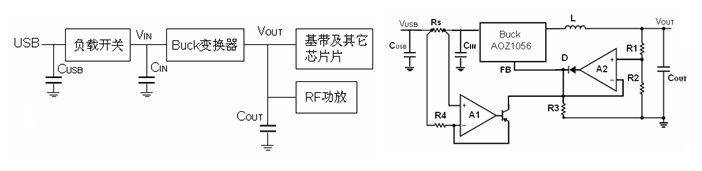 圖1b所示電路需要用二個(gè)運(yùn)放,A1用于檢測(cè)輸入電流,A2用于隔離電壓和電壓反饋信號(hào),以保證電壓和電壓反饋信號(hào)中只有其中的一個(gè)信號(hào)參與系統(tǒng)的反饋工作。二極管D防止運(yùn)放A2的輸出管腳出現(xiàn)灌入電流。請(qǐng)注意,在輸出瞬態(tài)過(guò)載時(shí),降壓變換器工作于恒流及限流模式,但仍輸出電流。在輸出瞬態(tài)過(guò)載期間,降壓變換器仍可以提供一定比例的輸出電流給射頻模塊,因此所需的輸出超級(jí)電容值可以減小。若限流值為0.5A,則輸出超級(jí)電容值可以減小25%。