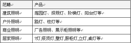 隨著技術(shù)的改善,LED燈具的用途已由過去數(shù)十年單純應(yīng)用在指示燈、信號燈等,逐步使用在手機背光源、車內(nèi)用照明、煞車燈、LCD電視、手提電腦背光源等輔助照明;而在近兩年內(nèi),其開始成為主照明系統(tǒng),所應(yīng)用的范疇可涵蓋建筑、戶外、商業(yè)、及居家等,產(chǎn)品則分別有: