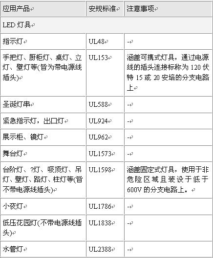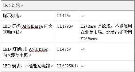 以下首先針對LED燈具、LED燈泡及LED驅(qū)動器等三種基本產(chǎn)品分類,及其分別沿用至各成品或零件時,所應(yīng)參考的UL安規(guī)標準及應(yīng)特別注意事項,以做為業(yè)者欲進行產(chǎn)品安規(guī)檢測的基本指南。不過該表僅供讀者參考,產(chǎn)品實際的歸類,仍須依產(chǎn)品的用途及其使用環(huán)境來決定。