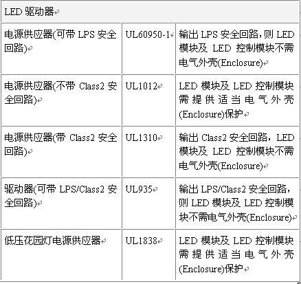 4.其它要求:如LED電源、LED數(shù)組、LED模塊及LED控制模塊等安全及外殼要求等。LED的電源可以是下列標準所驗證的電源供應(yīng)器,包括UL1012,UL1310及UL60950-1?;旧?,LED數(shù)組、LED模塊及LED控制模塊只要位于LPS/Class2安全回路上,就沒有任何電氣外殼的要求。LED燈具對于電源輸出方式的規(guī)定為基本絕緣,與完全沒有隔離是一樣的。對于LED數(shù)組、LED模塊及LED控制模塊,如果使用的電源不用大到超過LPS/Class2,建議最好要符合LPS/Class2。反之,若使用的能量將大于LPS/Class2,則有沒有提供隔離一次側(cè)與二次側(cè)電源電路的絕緣,對塑料外殼的要求上,是沒有差別的。