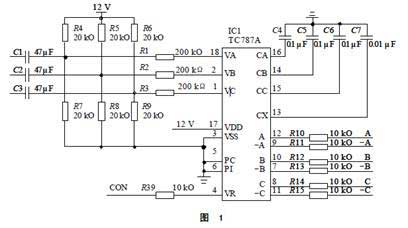 從同步變壓器來(lái)的三相過(guò)零信號(hào)經(jīng)C1、C2、C3電容耦合到6V的直流信號(hào)上送入18、2、1腳。TC787對(duì)其進(jìn)行過(guò)零檢測(cè),經(jīng)積分電容C4、C5、C6形成以過(guò)零點(diǎn)為起點(diǎn)的三角波,與由VR引入的觸發(fā)控制信號(hào)比較,再經(jīng)C7調(diào)制成觸發(fā)脈沖,由12、9、10、7、8、11腳輸出,由脈沖變壓器驅(qū)動(dòng)可控硅。