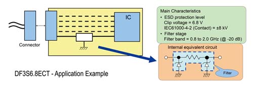 東芝美國(guó)電子元器件公司(TAEC)最新推出具有靜電放電(ESD)保護(hù)和電磁干擾(EMI)濾波的二極管。東芝DF3S6.8ECT保護(hù)二極管提供數(shù)字和移動(dòng)器件如:手機(jī),PDA,筆記本電腦,數(shù)碼相機(jī),以及具有EMI和ESD保護(hù)的GPS設(shè)備,這些靜電放電能源通過(guò)用I/O端口和通過(guò)連接器進(jìn)入到系統(tǒng)電路板上。