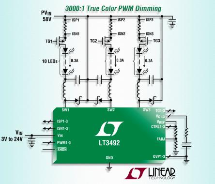凌力爾特公司 (Linear Technology Corporation) 推出 2.1MHz DC/DC 轉(zhuǎn)換器 LT3492,該器件為作為 3 通道恒定電流 LED 驅(qū)動(dòng)器工作而設(shè)計(jì)。LT3492 的 3 個(gè)通道中每一個(gè)都可以驅(qū)動(dòng)多達(dá) 10 個(gè) 300mA 的串聯(lián) LED,從而使它能夠以高達(dá) 96% 的效率驅(qū)動(dòng)多達(dá) 30 個(gè) 300mA LED。所有 3 個(gè)通道都由一個(gè)獨(dú)立的 True Color PWM™ 信號(hào)控制,從而使每個(gè)通道都能獨(dú)立調(diào)光至高達(dá) 3000:1 的調(diào)光比。固定頻率、電流模式架構(gòu)確保在寬的電源和輸出電壓范圍內(nèi)穩(wěn)定工作。頻率調(diào)節(jié)引腳使用戶能夠在 330kHz 至 2.1MHz 范圍內(nèi)設(shè)定頻率,以優(yōu)化效率,同時(shí)最大限度地減小外部組件尺寸。LT3492 的耐熱增強(qiáng)型 4mm x 5mm QFN (或耐熱增強(qiáng)型 TSSOP) 封裝為高達(dá) 50W LED 應(yīng)用提供一個(gè)占板面積高度緊湊的解決方案。