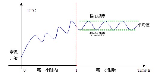 以單相馬達(dá)與自動復(fù)位熱保護(hù)器組合為例說明,其他情況請查閱相關(guān)標(biāo)準(zhǔn)。測試在室溫環(huán)境進(jìn)行,堵轉(zhuǎn)72小時,其間熱保護(hù)器必須因繞組溫度升高斷開電路又自動復(fù)位,儀器連續(xù)記錄繞組溫度,圖-1的示意圖由經(jīng)驗(yàn)所得。整個過程到結(jié)束,必須符合以下結(jié)果: