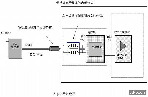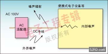 一般說(shuō)來(lái),便攜式電子設(shè)備內(nèi)部的噪聲是通過(guò)DC電源線以共模的方式輸出的,像在AC適配器導(dǎo)線上,其噪聲可以用共模噪聲濾波器進(jìn)行有效抑制。