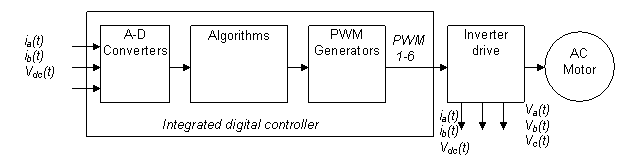 圖 1 是通用數(shù)字馬達(dá)控制系統(tǒng)的結(jié)構(gòu)簡圖。算法可在數(shù)字控制器上實(shí)施,數(shù)字控制器生成的控制輸出可通過逆變器驅(qū)動馬達(dá)。電流及電壓測量等反饋信號通過模數(shù)轉(zhuǎn)換器 (ADC) 反饋至該算法。