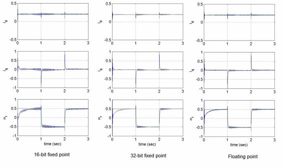 要比較三種數(shù)據(jù)格式對數(shù)值精度的影響,需要監(jiān)控估計(jì)速度響應(yīng)與相應(yīng)的d 及q 軸參考電流。將所有的PI 增益、參數(shù)、基本量在全部三種數(shù)據(jù)格式的仿真過程中設(shè)定為相同的有效值。從圖4 可以看出,16位定點(diǎn)版本與浮點(diǎn)版本的性能具有極大的差別。
