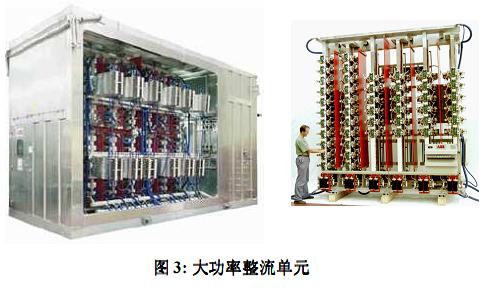 在整流應用中,由于沒有再生負載,額定電壓選擇依據(jù)整流器輸入線電壓。如果與3英寸或4英寸二極管或晶閘管配合使用,可以形成的整流器輸出為直流2100V,將可允許在一條生產(chǎn)線上有440只電解槽串聯(lián),這等效于每年39萬噸鋁的生產(chǎn)能力。