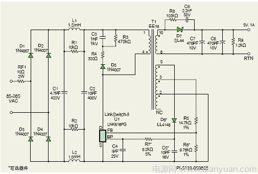 圖2是一款5W通用輸入恒壓/恒流(CV/CC)充電器/適配器的電路設(shè)計(jì)圖。本設(shè)計(jì)適用于手機(jī)電池充電器、USB充電器或任何有恒壓/恒流特性要求的應(yīng)用。該電路可為最高1A的負(fù)載提供5V恒流輸出,精度為±5%。當(dāng)需要更大負(fù)載時(shí),電源將進(jìn)入恒流模式,輸出電壓降低,使輸出電流維持在1A±10%。