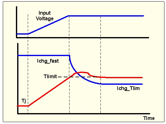 為解決此類散熱問題,可添加一個(gè)散熱環(huán)路,以降低充電電流并確保IC結(jié)點(diǎn)溫度低于熱關(guān)斷閾值。為bq2406X系列線性充電器添加了散熱環(huán)路的運(yùn)行如圖2所示。散熱環(huán)路在激活狀態(tài)下可有效降低充電電流,降低充電器級(jí)功率MOSFET的功耗。