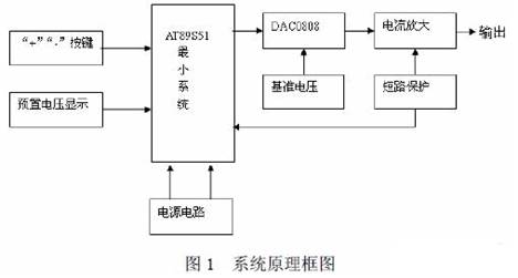 本系統(tǒng)是以AT89S51 單片機為核心控制器,具有電壓可預(yù)置、可步進調(diào)整、輸出的電 壓信號和預(yù)置的電壓信號可同時顯示的數(shù)控直流電源,其硬件原理方框圖如圖1 所示。系統(tǒng) 由AT889S51 控制電路、鍵盤電路、電源電路、D/A 電路、功放電路、短路保護及報警電路、 穩(wěn)壓輸出電路、LED 顯示電路八部分組成。系統(tǒng)通過“開關(guān)”、“+”、“-”三個按鍵來控制預(yù)置電壓的升降,并通過數(shù)碼管顯示。AT89S51 單片機送出相應(yīng)的數(shù)字信號,在D/A 轉(zhuǎn)換之 后輸出電流,經(jīng)集成運放LM358 轉(zhuǎn)換、三極管放大、RC 網(wǎng)絡(luò)濾波,最終穩(wěn)定。同時由LED 數(shù)碼管顯示輸出電壓;由數(shù)字電壓表測量實測值。