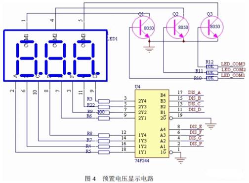 預(yù)置電壓顯示電路如圖4 所示。本設(shè)計選用譯碼驅(qū)動器74F244,用來驅(qū)動LED 數(shù)碼管 顯示預(yù)置電壓,分別由單片機P2.0~P2.7 接口控制。LED 共陰極控制端由P1.4~P1.6 接口 控制,并用三極管8050 來控制LED 的顯示。