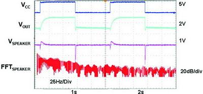 圖2耳機(jī)驅(qū)動器上電和斷電時耳機(jī)上測到的電壓波形和頻譜