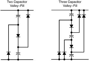 業(yè)界有關(guān)無源(Passive)功率因數(shù)校正(PFC)的方案眾多,這些方案通常都使用較多的額外元器件,其中的一種方案就是谷底填谷(valley-fill)整流器,其中采用的電解電容和二極管組合增大了線路頻率導(dǎo)通角,從而改善功率因數(shù)。實(shí)際上,這個過程利用高線路電壓以低電流給串聯(lián)電容充電,然后在較低電壓時以較大電流讓電容放電給開關(guān)穩(wěn)壓器。典型應(yīng)用使用2個電容和3個二極管,而要進(jìn)一步增強(qiáng)功率因數(shù)性能,則使用3顆電容和6個二極管。