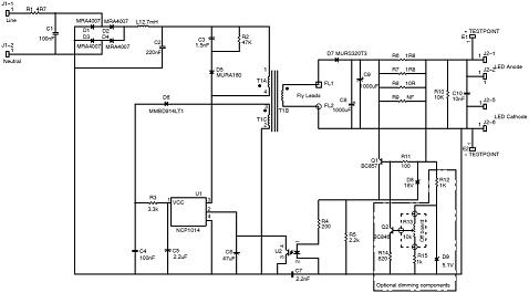 安森美半導(dǎo)體的NCP1014LEDGTGEVB評估板經(jīng)過了優(yōu)化,可以驅(qū)動1到8顆大功率高亮度LED,如CreeRebel、SeoulSemiconductorZ−Power®或OSRAMGolden?XR−E/XP−E、Luxeon™?XLAMP®Dragon™。這設(shè)計基于集成了帶內(nèi)部限流功能的高壓電源開關(guān)的緊湊型固定頻率脈寬調(diào)制(PWM)轉(zhuǎn)換器NCP1014構(gòu)建。由于NCP1014采用固定頻率工作,電流不能上升到高于某個特定點(diǎn);這個點(diǎn)由輸入電壓及開關(guān)周期或?qū)〞r間結(jié)束前的初級電感來確定。由于導(dǎo)通時間的限制,輸入電流將跟隨輸入電壓的波形,從而提供更高的功率因數(shù)。相關(guān)電路圖見圖2。