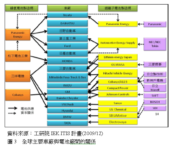 全球車用電池廠商以Sanyo、Cobasys、Panasonic為首,而隨著HEV、PHEV、EV..等話題不斷的吵熱,也吸引越來越多廠商投入市場(chǎng)。當(dāng)前電池芯廠商的家數(shù)相較於全球車廠的家數(shù)少,所以車廠與電池芯廠間如何取得合作關(guān)係以確保電池芯的來源就相當(dāng)重要。當(dāng)前各家車廠與電池芯廠的合作關(guān)係如圖3,當(dāng)前重點(diǎn)的歐美、日系以及韓系的車廠都己有確切的合作結(jié)盟廠商。