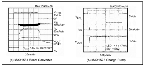 圖6.MAX1561升壓轉換器(a)和MAX1573電荷泵(b)的軟啟動和關斷波形都表明沒有輸入過沖電流(IIN),使電池跌落最小,以免對系統(tǒng)的其它電路造成影響。