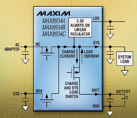 MAX8934可以采用獨(dú)立的USB和交流適配器電源輸入供電,也可用單個(gè)輸入連接兩種電源。直流輸入限流值最高可調(diào)節(jié)至2A,USB輸入限流值最高可調(diào)節(jié)至1.5A*。直流與USB輸入均支持100mA、500mA、1.5A和USB掛起模式。充電電流最高可調(diào)節(jié)至1.5A,支持較寬范圍的電池容量。器件的其它特性包括:防止過熱的熱調(diào)節(jié)環(huán)路、自適應(yīng)電池充電功能在滿足系統(tǒng)負(fù)載供電的前提下為電池充電、OVP (過壓保護(hù))、漏極開路充電狀態(tài)和故障指示輸出、電源就緒監(jiān)測器、充電定時(shí)器以及電池溫度監(jiān)測器。