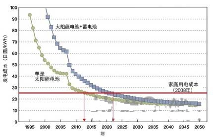 如同人們經(jīng)常指出的,太陽能發(fā)電確實(shí)也有缺點(diǎn):下雨時(shí)輸出會(huì)很低,在陰天及其他情況時(shí)會(huì)有大幅波動(dòng),而且在夜晚時(shí)為零。然而,透過使用蓄電池后可以克服大部分的問題。如果配有蓄電池的太陽能發(fā)電系統(tǒng)達(dá)到與市電同價(jià)后,將會(huì)有很大的沖擊(其中包括減少石化燃料消耗)。日本經(jīng)濟(jì)產(chǎn)業(yè)研究所(RIETI)已預(yù)估大約2022年,配有蓄電池的家用太陽能發(fā)電系統(tǒng)將達(dá)到與市電同價(jià)(圖10)。