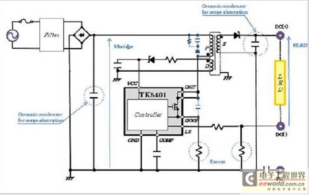 創(chuàng)意電子新近推出的TK5401就是這樣一款LED驅(qū)動(dòng)電源IC,它具有不需要DC電源特性中所必須的電解電容的特性,使得LED壽命高達(dá)4萬(wàn)小時(shí)以上。據(jù)介紹,TK5401封裝內(nèi)置了高電壓功率MOS管及控制電路,因去除電解電容實(shí)現(xiàn)了小型化、低成本,并且實(shí)現(xiàn)了LED燈的長(zhǎng)壽命和高效能。
