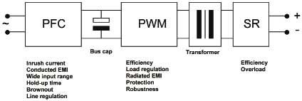 脈寬調(diào)制級(jí)(PWM)是主要的轉(zhuǎn)換器級(jí)。其中DC電壓被斬波為更高頻率的方波,因此利用更小的變壓器就可以轉(zhuǎn)換到另一個(gè)電壓級(jí)并提供隔離。并非所有的拓?fù)涠疾捎谜伎毡茸兓姆讲ǎ行┩負(fù)洳捎玫氖亲冾l,還有的則是改變兩個(gè)脈沖序列之間的相位。這一級(jí)主要確定轉(zhuǎn)換器的效率和負(fù)載調(diào)節(jié)。轉(zhuǎn)換器效率十分重要,首先它關(guān)系電源的運(yùn)行成本;其次是必須通過機(jī)箱冷卻來散除產(chǎn)生的熱量;第三是熱組件越大,就越昂貴,占用空間也越大。這三個(gè)因素與電源的使用壽命成本關(guān)系重大。