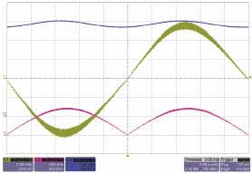 圖3中,綠色曲線的較厚區(qū)域代表電流紋波,PFCIC在峰值輸入電壓下消耗電流較多,過零時(shí)沒有電流。粉色曲線代表整流器輸入電壓,藍(lán)色曲線為輸出電壓。