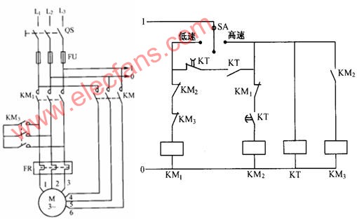 1、雙速三相交流異步電動機手動控制變極調(diào)速線路