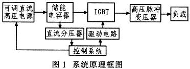 系統(tǒng)工作過程如下:由控制系統(tǒng)控制可調(diào)直流高壓電源給儲(chǔ)能電容器充電,當(dāng)充電電壓達(dá)到設(shè)定值后,再控制IGBT按照設(shè)定的頻率和脈沖寬度導(dǎo)通,產(chǎn)生脈沖電壓加在高壓脈沖變壓器原邊,最后由高壓脈沖變壓器升壓,產(chǎn)生所需的高壓脈沖加在負(fù)載上。