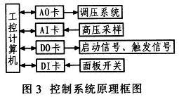 控制系統(tǒng)原理框圖如圖3所示。通過計(jì)算機(jī)控制AO卡(模擬量輸出)輸出0~10V的模擬量,用來控制調(diào)壓系統(tǒng)中的可控硅調(diào)壓器的輸出。儲(chǔ)能電容器上的電壓經(jīng)過高壓采樣和AI卡(模擬量輸入),由計(jì)算機(jī)采集。計(jì)算機(jī)控制DO卡(數(shù)字量輸出)輸出控制信號(hào)控制各類啟動(dòng)開關(guān)和IGBT驅(qū)動(dòng)板輸出觸發(fā)信號(hào)。各類手動(dòng)面板的開關(guān)信號(hào)經(jīng)過DI卡(數(shù)字量輸入),由計(jì)算機(jī)采集。