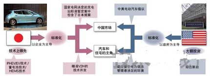 圍繞充電基礎(chǔ)設(shè)施的主導(dǎo)權(quán)之爭(zhēng),不僅是企業(yè)之間,而且是國(guó)與國(guó)、地區(qū)與地區(qū)之間的較量。競(jìng)爭(zhēng)的舞臺(tái)就是把車(chē)輛與住宅、車(chē)輛與電網(wǎng)之間交換的電力信息及電力的規(guī)格進(jìn)行標(biāo)準(zhǔn)化。隨著充電基礎(chǔ)設(shè)施的發(fā)展,汽車(chē)及住宅都有可能變成“通信終端”,那么這些終端之間的通信標(biāo)準(zhǔn)化就不可或缺。所以,為了形成有利于本國(guó)企業(yè)的規(guī)格,各國(guó)都開(kāi)始競(jìng)爭(zhēng)。