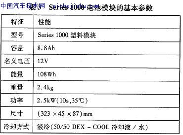 Cobasys是ChevronTexacoTechnologyVenture(美國(guó)第二大能源公司)和ECD(EnergyConversionDevices)的合資公司。ECD全資控股Ovonic,Ovonic擁有很多關(guān)于鎳氫電池方面的專(zhuān)利,全世界生產(chǎn)鎳氫電池的企業(yè)須得到它的許可才能生產(chǎn)銷(xiāo)售oCobasys不僅只是技術(shù)的研發(fā),而且把研發(fā)的技術(shù)推廣到產(chǎn)業(yè)化的水平。Cobasys專(zhuān)門(mén)為混合動(dòng)力汽車(chē)開(kāi)發(fā)8.8Ah的Series1000電池模塊。其基本參數(shù)見(jiàn)表3。