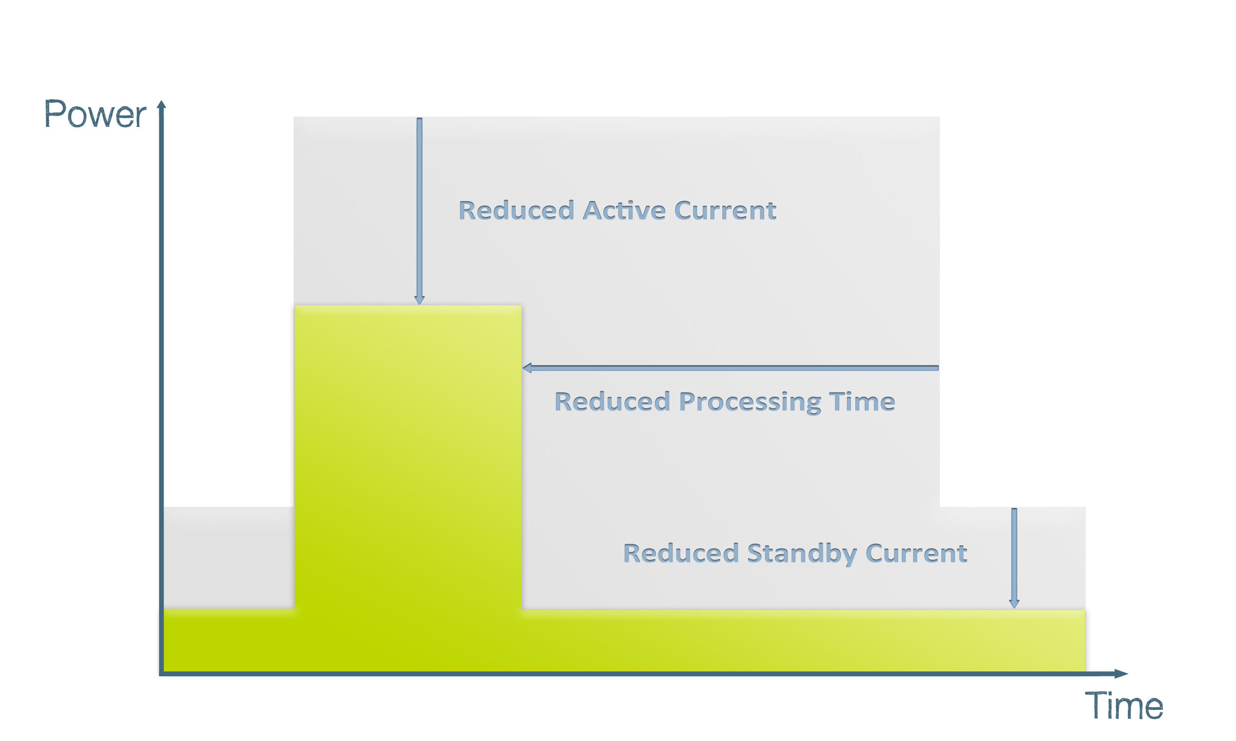 圖2:節(jié)能MCU內(nèi)核通過完整的喚醒/操作/回到睡眠周期在多個不同區(qū)域節(jié)省能源。藍色區(qū)域表示一個更強大的32位內(nèi)核完成任務(wù)所節(jié)省的能量,所需的周期比一個8位內(nèi)核需要的少,在活躍和睡眠模式下消耗的電流也較少。