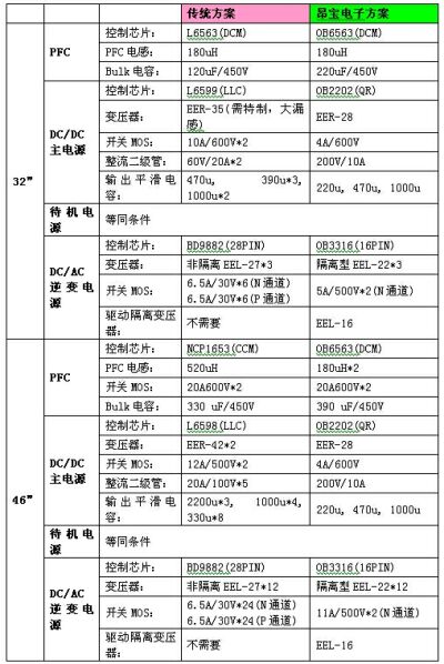 以某知名品牌32"與46"LCDTV進(jìn)行對比,昂寶電子所開發(fā)的LCDTV整體電源解決方案在整體功耗及關(guān)鍵零件數(shù)量方面均比傳統(tǒng)電源方案有明顯的優(yōu)勢: