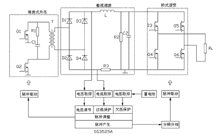 本逆變器輸入端為汽車蓄電池(+12V,4.5Ah),輸出端為工頻方波電壓(50Hz,220V)。其系統(tǒng)主電路和控制電路框圖如圖1所示,采用了典型的二級變換,即DC/DC變換和DC/AC逆變。12V直流電壓通過推挽式變換逆變?yōu)楦哳l方波,經高頻升壓變壓器升壓,再整流濾波得到一個穩(wěn)定的約320V直流電壓;然后再由橋式變換以方波逆變的方式,將穩(wěn)定的直流電壓逆變成有效值稍大于220V的方波電壓,以驅動負載。為保證系統(tǒng)的可靠運行,分別采集了DC高壓側電壓信號、電流信號及蓄電池電壓信號,送入SG3525A,通過調整驅動脈沖的占空比或關斷脈沖來實現(xiàn)電壓調節(jié)、過流保護及欠壓保護等功能。